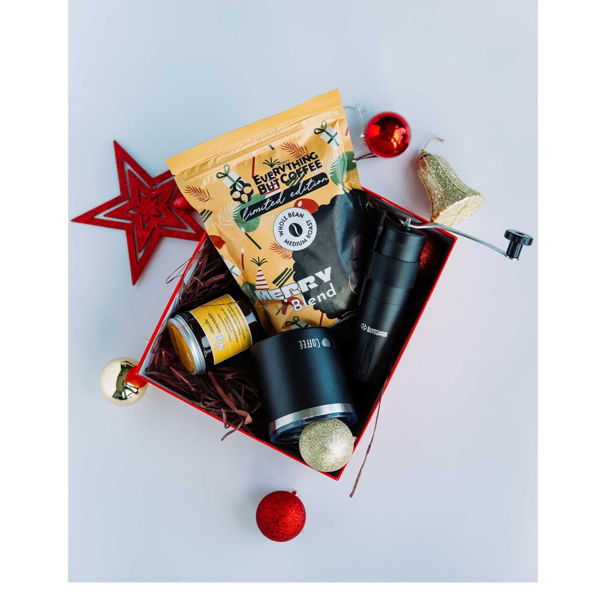 A classic holiday-themed package featuring coffee essentials designed to brighten any Christmas morning.